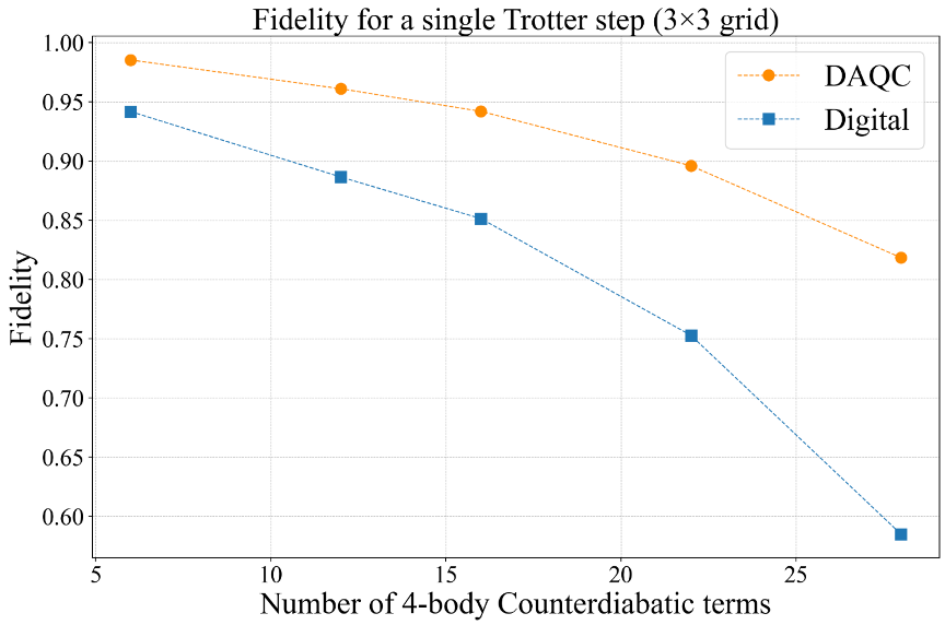 Intuitively, a method working well on 9 qubits with many k-local interactions for a single trotter step, one expects the advantage to grow with system size. Larger systems typically have even more terms in their Hamiltonians (more pairs, more possible multi-qubit interactions), so a fully digital approach would face an explosion of gates and Trotter steps to maintain accuracy. The DAQC approach, by harnessing the analog parallelism and with CD driving, can keep the simulation manageable. For example, imagine scaling from a 3×3 grid to a 5×5 grid of qubits. The number of possible 4-body terms (like plaquettes on a lattice) increases dramatically. A digital approach would need muliple layers (depth) of gate sequences for each of these terms, dropping the fidelity unless the number of steps is increased (which then makes the circuit longer and more prone to noise). DAQC would aim to cover many of those interactions in just a few analog block sequences, preserving fidelity without a combinatorial increase in circuit depth.