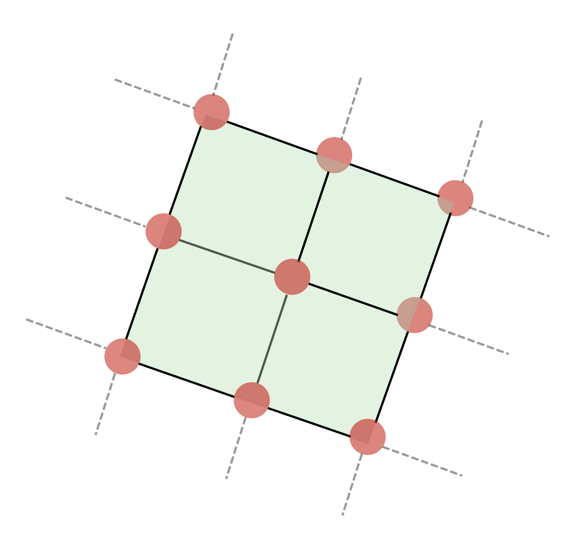 Figure 1: Grid-based superconducting processors: Layout of the superconducting processor consisting of nearest neighbor qubits (red dots). Native exchange interactions of the processor can be used as analog blocks.