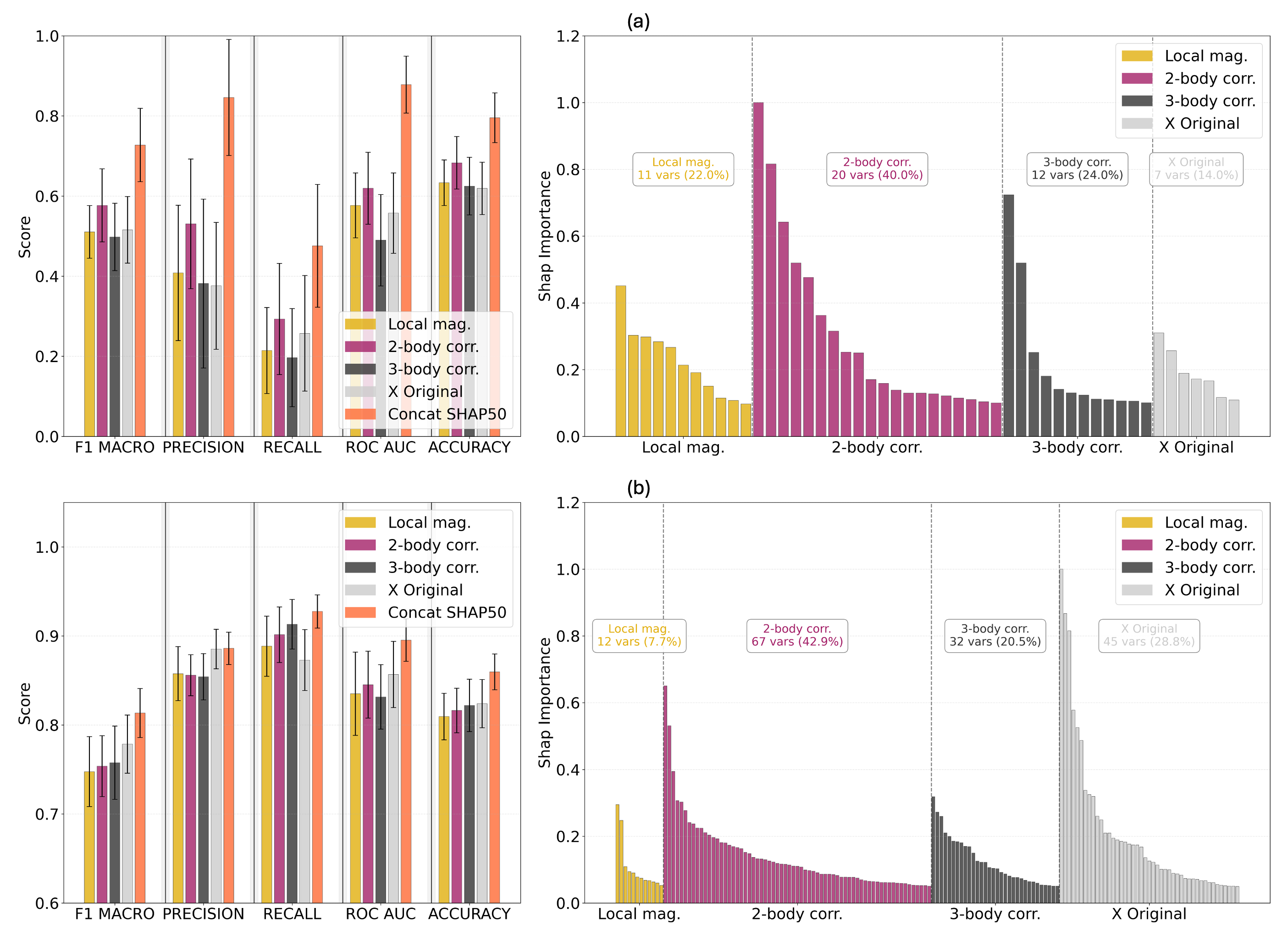 Figure 3: Performance and feature importance for the two tasks. (a) Molecular toxicity classification and (b) breast tumor detection. Left: model performance using classical and quantum features. Right: SHAP analysis showing which features contribute most to the predictions.