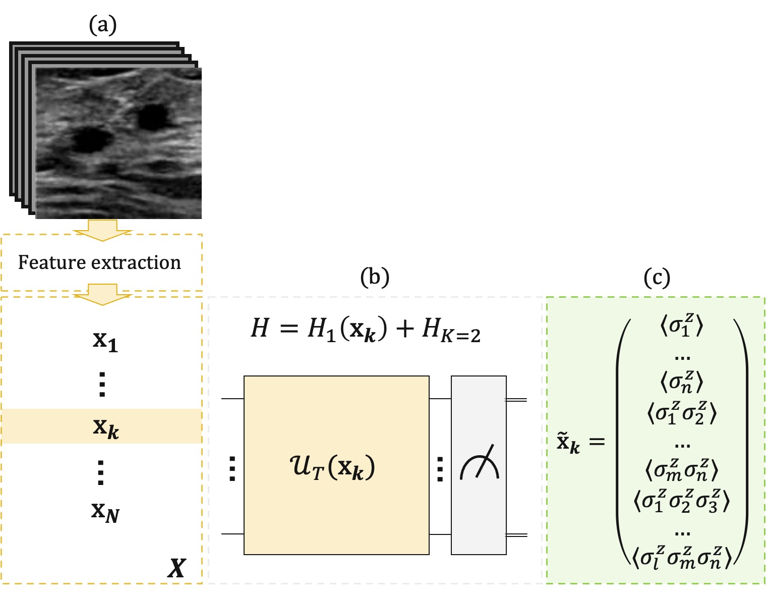 Figure 2: Protocol for the image classification case, combining classical and quantum feature extraction methods. (a) Image-based dataset, where conventional feature extraction techniques are used to construct a tabular dataset X, from which samples and classical correlations are selected. (b) The extracted information from X is encoded into the local fields and two-body coefficients of a spin Hamiltonian. (c) Local magnetizations and quantum correlations are measured and concatenated, forming the quantum-extracted features.