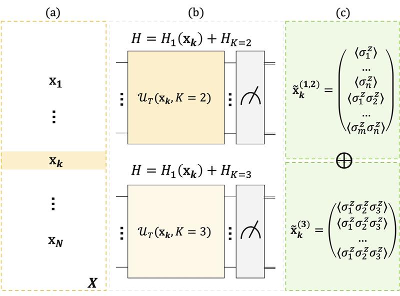 Figure 1: Each data sample (a molecule, an image, etc.) is encoded into a spin-glass Hamiltonian. (a) Tabular dataset X, from which samples and classical correlations are selected. (b) The extracted information from X is encoded into the local fields and higher-order coefficients of spin Hamiltonians differing in the order of interaction terms. (c) Local magnetizations and quantum correlations are measured from the two circuits and concatenated, yielding the quantum-extracted features.