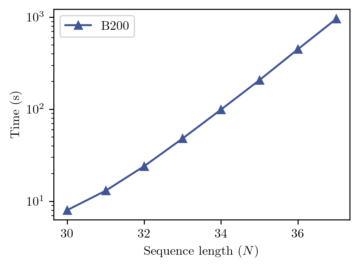 Figure 4. Runtime to simulate the quantum circuits using 8 B200 GPUs with 1440GB. This multi GPU setup can reach the simulation of up to 37 qubits circuits.