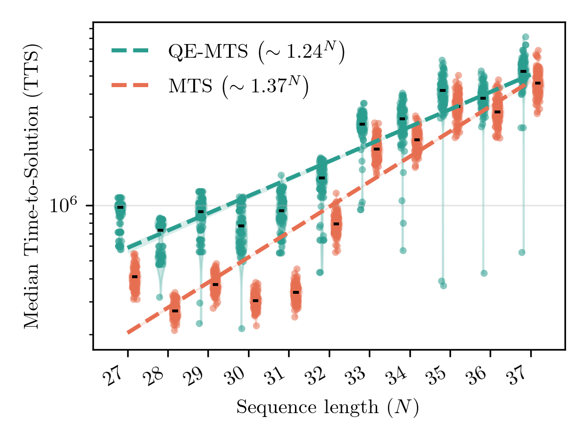 Across sequence lengths from 27 to 37, QE-MTS shows a typical scaling of O(1.24N), improving upon the O(1.34N) scaling of the best classical baseline. That difference may look small on paper, but in exponential growth, it is transformative. The analysis projects a crossover around N ≈ 47, where QE-MTS becomes faster than classical MTS for typical runs, widening its advantage as system size increases.