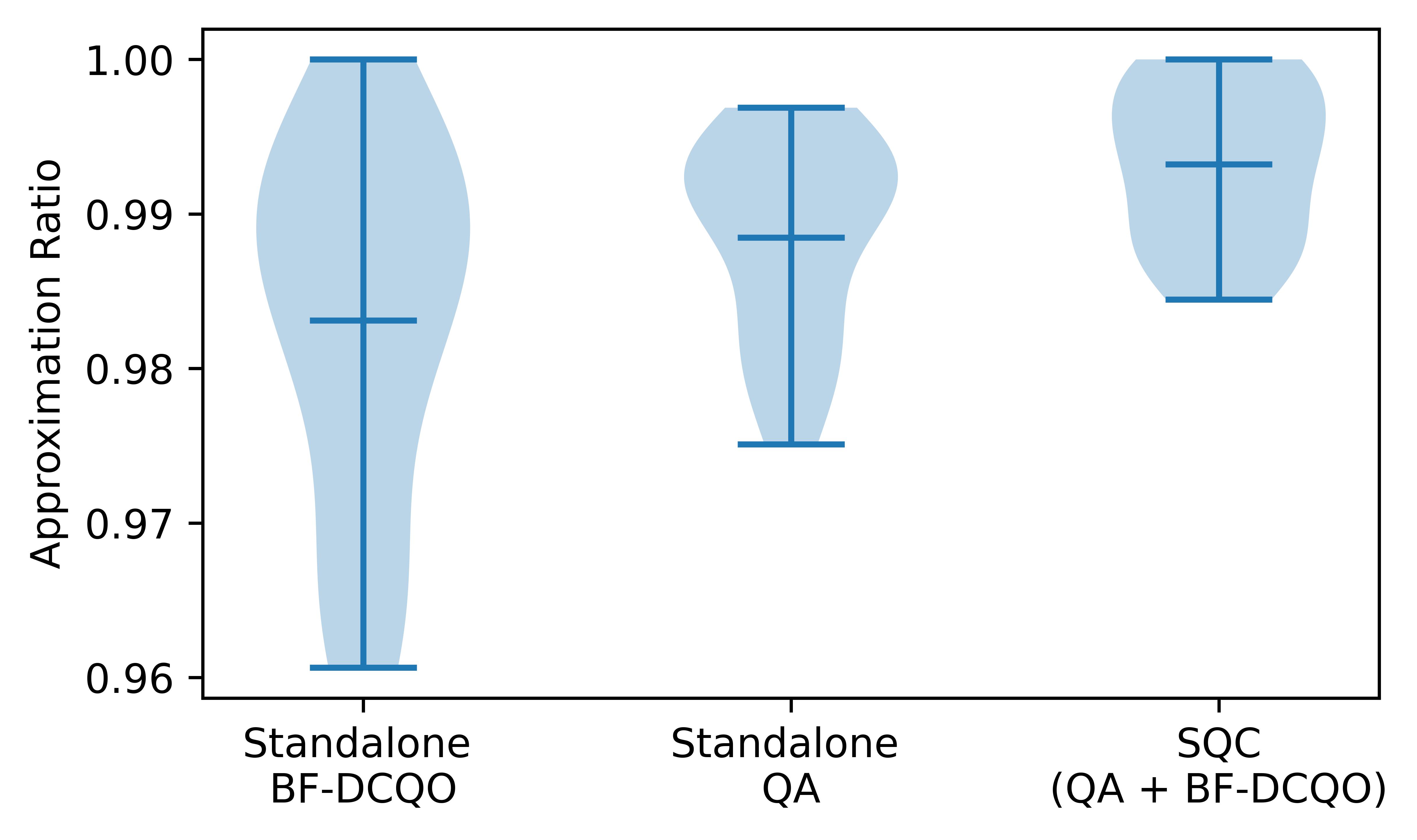 Figure 3. Approximation ratio distribution over the studied instances for the three methods: BF-DCQO on digital IBM, QA on analog D-Wave, and the combination of both as a SQC approach.