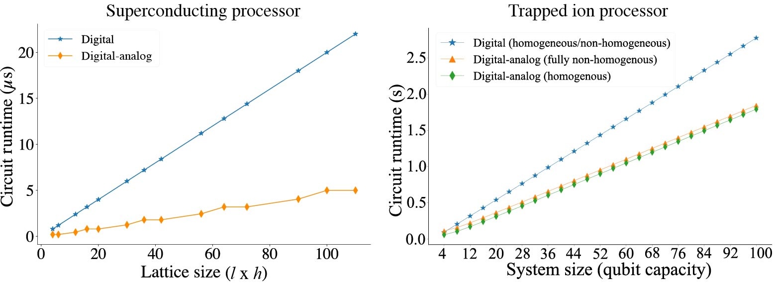 Moreover, with Digital-Analog Counterdiabatic Quantum Optimization (DACQO) one can solve larger optimization problems at the quantum advantage level with a smaller gate count and less runtime using digital-analog encodings [DAQC for optimization with trapped ions], see Fig. (right). We have provided preliminary evidence of scaling up for optimization problems using DACQO with trapped ions, and we are now extending this approach to other hardware platforms, including superconducting circuits, neutral atoms, photonic, and semiconductor quantum processors. We have demonstrated that such digital-analog encodings, which combine native analog hardware interactions with digital gate operations, can lead to significant speedups in time-to-solution and improvements in solution quality.