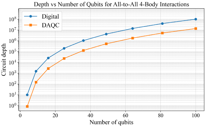 Performing a scaling analysis for the digital-analog decompositions, for a single Trotter step, we find that DAQC maintains one order (10-times) less scaling in the required circuit depth compared to the pure digital (Fig. 2). When run on hardware, this depth compression will not only help mitigate numerical error accumulation but also the experimental, since the required circuit fidelity falls abruptly with the gate fidelity as Fidelitym where m is the number of gates. This brings larger, more complex problems within reach of today's quantum devices.