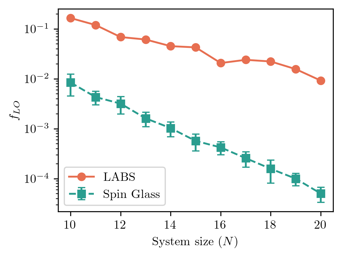 Figure 2. Density of single-flip local minima across different system sizes N for the LABS problem and the spin-glass SK case. This quantifies the number of configurations in which no single flip reduces the energy, compared to the total number of configurations. This supports why LABS is a more challenging problem than a common spin-glass benchmark.
